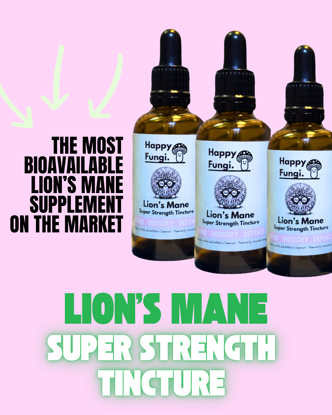 Our Super Strength Lion’s Mane Tincture is triple-extracted for maximum bioavailability, meaning your body absorbs more of the good stuff. Unlike powders that need to be digested, our liquid extract goes straight into your system for quick, lasting results. Grown in Somerset using renewable energy, we craft every drop for efficiency, potency, and purity—so if you’re looking for the best Lion’s Mane supplement, you’ve found it.