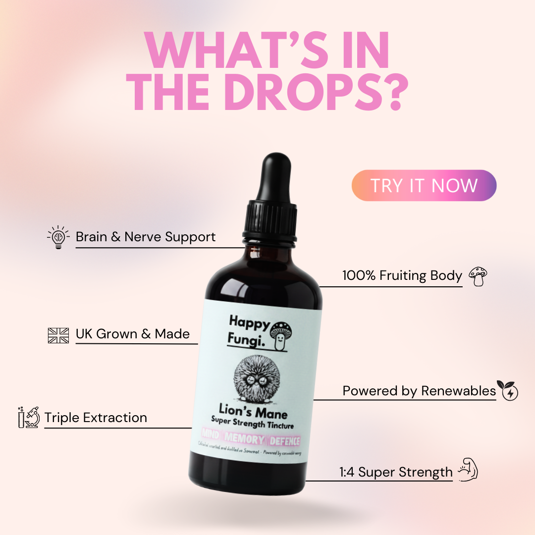 I’m not in this to follow trends. I started Happy Fungi to do things properly: with intention, integrity, and a bit of fun. No fillers. No shortcuts. Just potent Lion’s Mane, grown in my pink container and extracted with purpose.