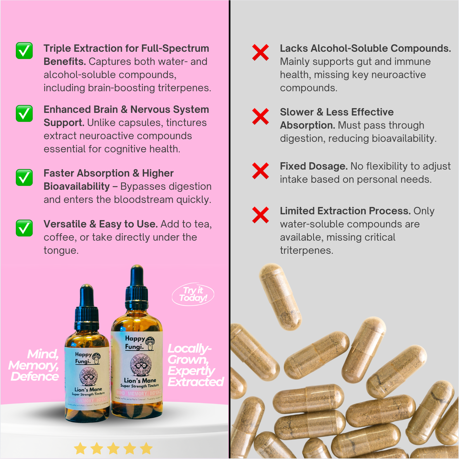 We use an advanced triple-extraction method, including ultrasonic extraction, to ensure you get the most bioavailable compounds, including beta-glucans and hericenones.